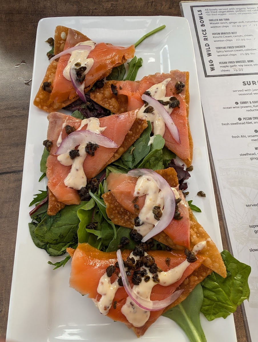 smoked lox, crispy wontons, red onion, dijon ailoi
